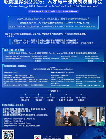 由加拿大黑龙江总商会(CHCOC)与职业发展人才管理平台Eggdemy联合主办的“职能量聚变2025:人才与产业发展领袖峰会”(Career Energy 2025: Summit on Talent and Industrial Development),将于2025年10月11日(星期六)下午在万锦市政府市政中心(Markham Civic Centre)盛大举行。预计将有超过300名嘉宾、企业代表、学者及青年人才现场参与,活动亦将通过线上平台同步直播。