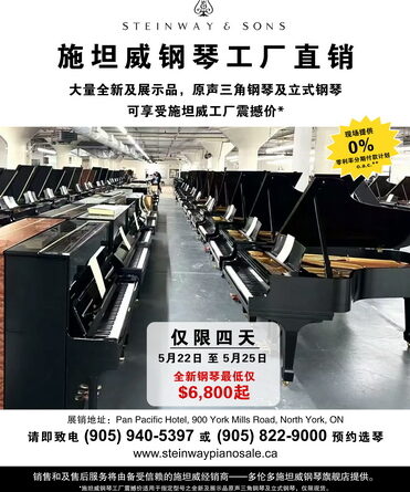 全球顶级钢琴品牌施坦威(Steinway & Sons)即将于2025年5月22日至25日在多伦多泛太平洋酒店(Pan Pacific Toronto, 900 York Mills Road)举办为期4天的“工厂钢琴特卖会”。本次活动由施坦威总部官方发起,面向公众开放预约,将展出有史以来最齐全的施坦威及其旗下设计品牌 Boston 与 Essex 钢琴。