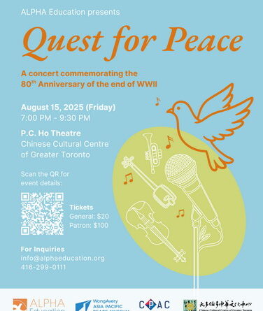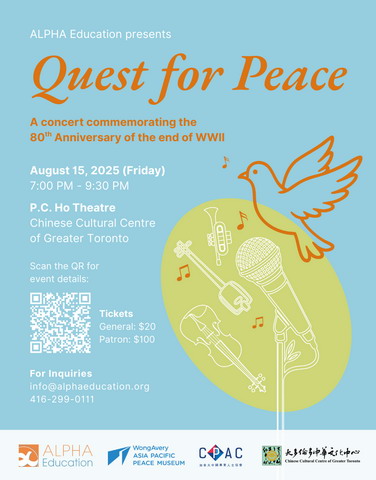 亚太和平教育中心(ALPHA Education)暨亚太和平博物馆 (WongAvery APPM)、加拿大中国专业人士协会 (CPAC)、大多伦多中华文化中心(CCCGT)将于8月15日(星期五)晚上7时至9时半在位于士嘉堡的大多伦多中华文化中心何伯钊剧院 (5183 Sheppard Ave E) 联合举办亚洲二战结束八十周年纪念活动。