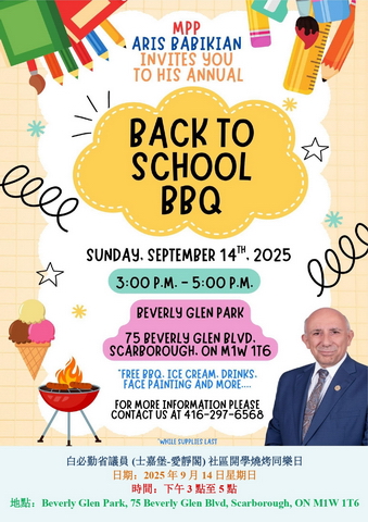 为庆祝新学年的开始,安省议员白必勤(Aris Babikian,士嘉堡–爱静阁选区MPP)将于 2025年9月14日(星期日)下午3时至5时 在 Beverly Glen 公园(75 Beverly Glen Blvd, Scarborough, ON M1W 1T6) 举办一年一度的 “Back-to-School BBQ”。