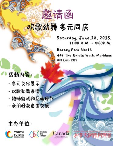 由同一个家和青少年未来发展基金会举办,加拿大湖南同乡会协办的欢歌劲舞,多元同庆-2025多元文化日庆祝活动将于2025年6月28日星期六在Berczy North 公园隆重举行。