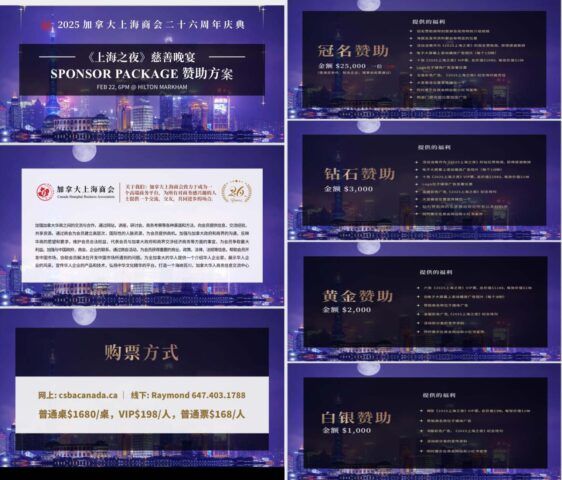 门票及赞助现已开放,欢迎各界人士参与,支持我们的活动,共ྠ见证这场华丽盛宴!媒体联系:加拿大上海商会秘书处联系人:Raymond +1 (647) 403-1788 或 info@csbacanada.ca支付方式: EMT:info@csbacanada.ca或支票: Canada Shanghai Business Association
