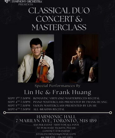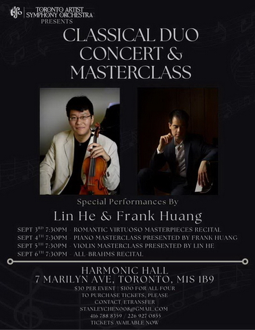 2025年9月初,多伦多艺术家交响乐团(TASO)将推出两场令人期待的小剧场室内乐演出,分别于9月3日与9月6日举行,并邀请到两位活跃于北美音乐舞台的华裔音乐家——小提琴家何林(Lin He)与钢琴家弗兰克·黄(Frank Huang)联袂登台。此外,两位艺术家还将在多伦多举办大师课,分享他们在演奏与教学上的丰富经验。门票现已发售。