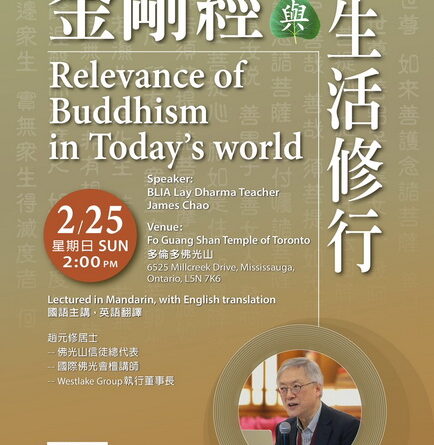 多伦多佛光山与国际佛光会多伦多协会,联合邀请国际佛光会檀讲师赵元修居士,2024年2月25日,于多伦多佛光山,以「金刚经与生活修行」为题,分享他个人修持《金刚经》的经验与心得。赵居士国语主讲,即席口译粤语、英语。